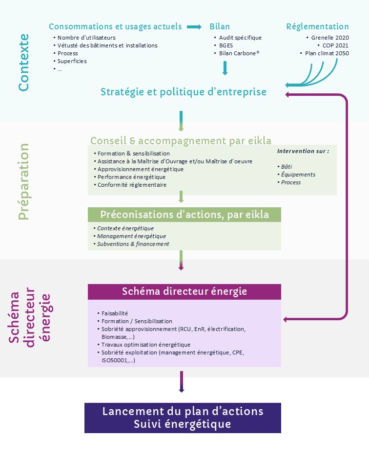 La deuxième étape logique, et selon une démarche volontaire, est la mise en place d’un schéma directeur énergétique à l’échelle d’une organisation qui permet de regrouper à la fois :